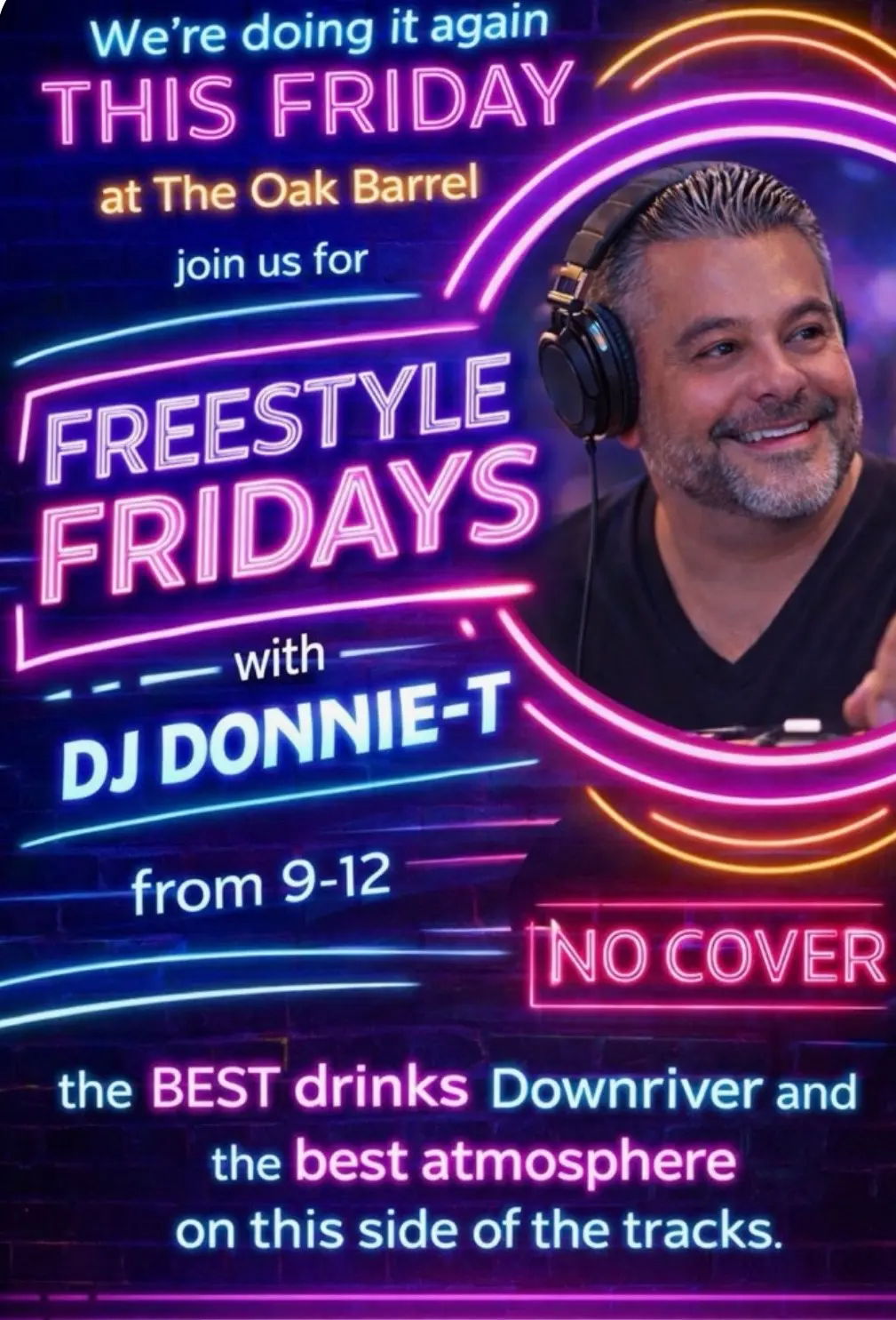 Catch DJ Donnie‑T throwing down live sets at Prime 166 and The Oak Barrel—